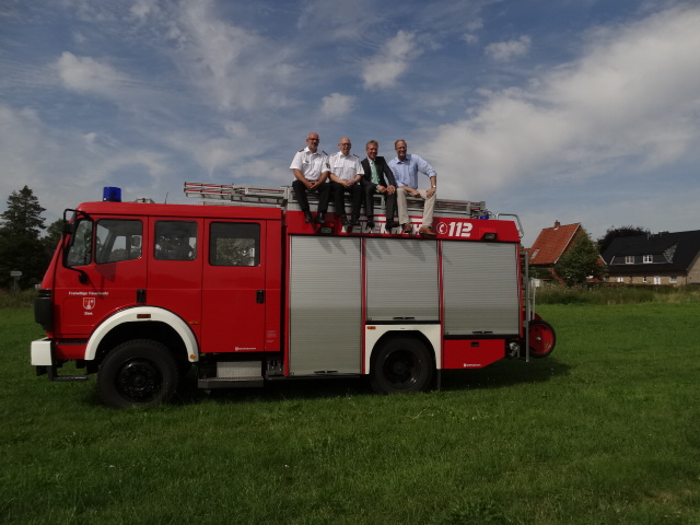 Foto: Ganz obenauf in Siek: Tobias Koch (v. r.), Bürgermeister Andreas Bitzer, Kai-Willi Bredenkamp (Ortswehrführer) und Holger Wollmer (Gemeindewehrführer) posieren am Standort des neuen Feuerwehrger