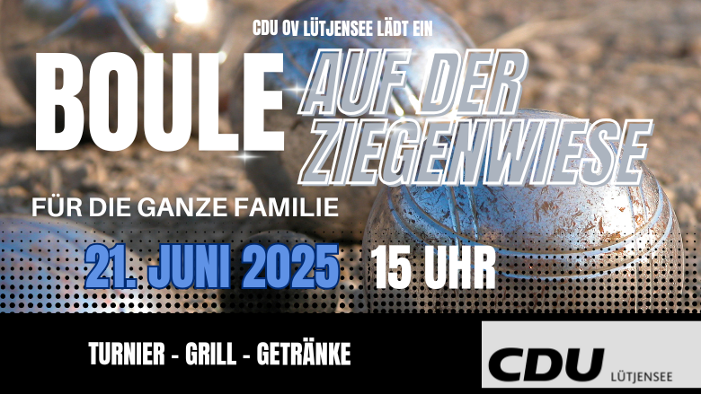 Am 21. Juni von 15- 18 Uhr gibt es ein kleines Boule-Turnier nebst Grillung auf der Ziegenwiese. Veranstalter ist der CDU Ortsverband Lütjensee. Für das leibliche Wohl ist gesorgt.
