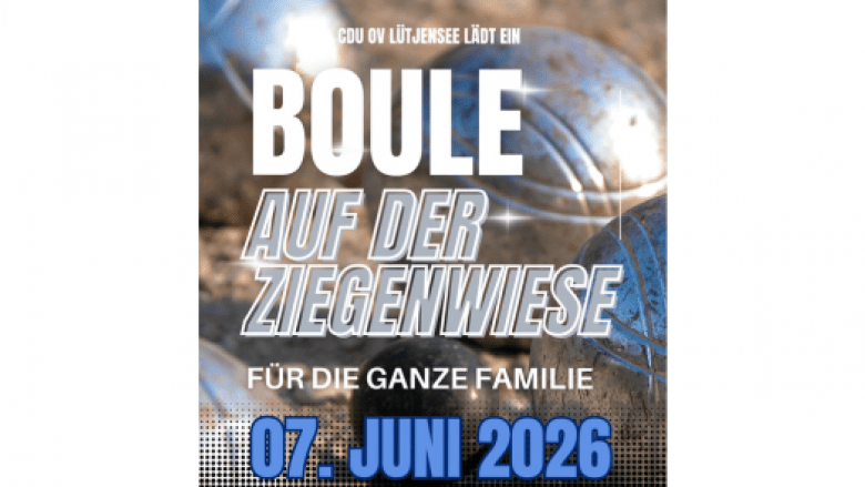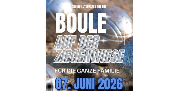 Am 07. Juni 2026 von 15- 18 Uhr gibt es ein kleines Boule-Turnier nebst Grillung auf der Ziegenwiese. Veranstalter ist der CDU Ortsverband Lütjensee. Für das leibliche Wohl ist gesorgt. Der für unseren Wahlkreis in den Bundestag gewählte Henri Schmidt wird ebenfalls dabei sein.