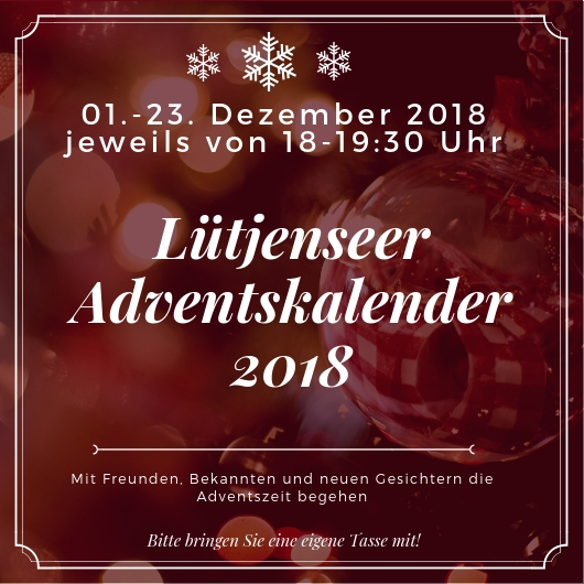 Jeweils um 18 Uhr öffnet sich in Lütjensee vor einem anderen Haus eine Tür zum lebendigen Adventskalender unseres Ortes. Geniessen Sie als Familie oder Single gemütliche Gemeinsamkeit mit winterlich, weihnachtlichen Geschichten, Liedern, Getränken und lernen Sie den Ort und seine Menschen kennen.